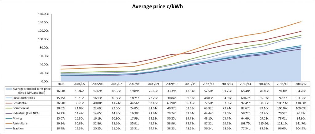 South Africa has witnessed a very steep increase in the price of electricity over the last few years. In the last 10 years, Eskom tariffs have increased by 356% against an inflation of 74% in that same time frame. Average prices from 2003-2017 are shown below.