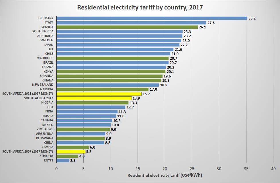 These increases have moved the country from low-cost to mid-range in terms of electricity tariffs compared with other countries. The chart below depicts this comparison with South Africa tariffs for 2007, 2017, and 2018 in yellow, select African countries in green, and some developed nations in blue.