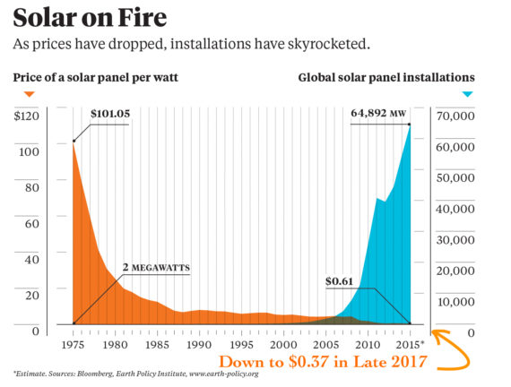 According to the World Bank Global Solar Atlas, South Africa has very high photovoltaic (PV) power potential. The cost of solar PV technology has been rapidly declining over the past 5 years. This is due to technology innovation, competition, economies of scale, and favorable policies. The global cost of utility-scale solar PV declined by 73% from 2010-2017. New records continue to be broken as solar PV and solar power cost beat projections and continue to fall. South Africa currently has the lowest cost of operating a solar PV plant on the continent. The figure below shows the reduction in the price of solar panels and the number of global installations in the last few decades.